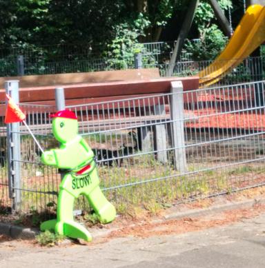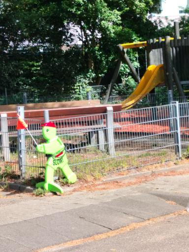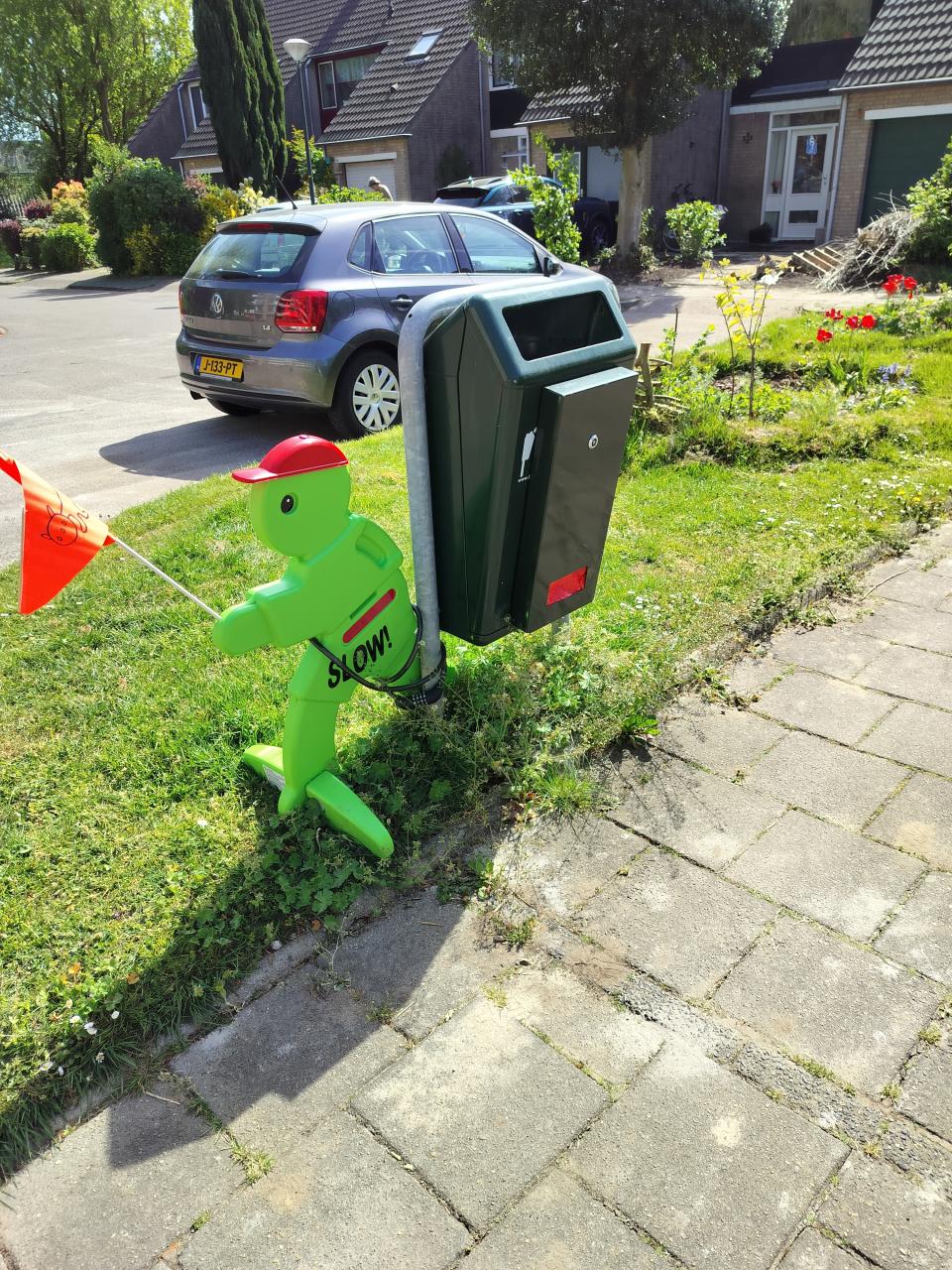 Op 26 april heb ik drie Victor Veilig poppen geplaatst rondom het Nieuwland plein. Met hangsloten met cijfercode heb ik ze vastgemaakt. Ik heb goed nagedacht waar ze het beste opvielen, zonder bijvoorbeeld een stuk stoep te barricaderen.