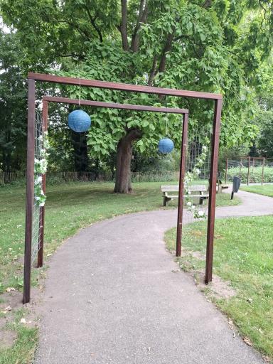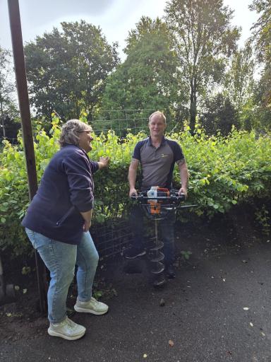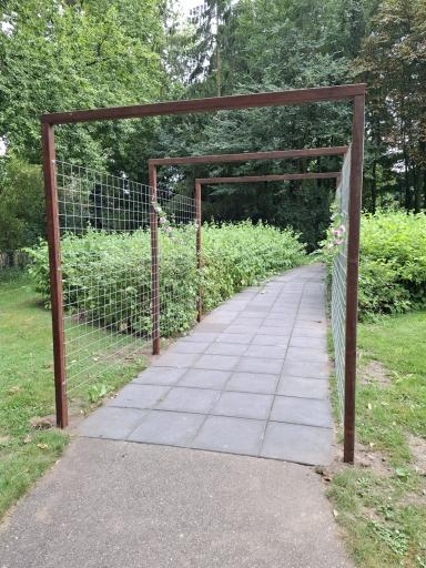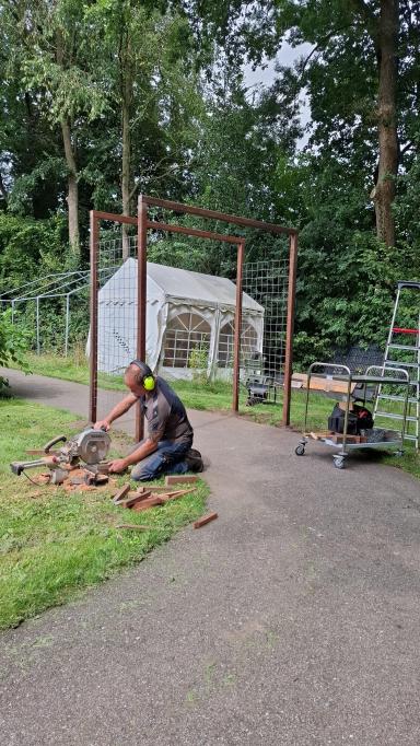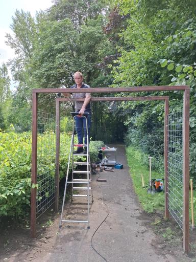 De Pergola's staan! Het zijn in totaal 5 mooie pergola's geworden. De servicemedewerker heeft hard gewerkt om dit te realiseren. Het was een leuke klus die veel bewondering van de bewoners kreeg. Het boren van de gaten zat wel wat tegen, maar de grondboor, die we met korting mochten lenen bij OSMA Renkum, heeft goed resultaat geleverd. De beplanting zal hopelijk in dit najaar geplaatst kunnen worden.