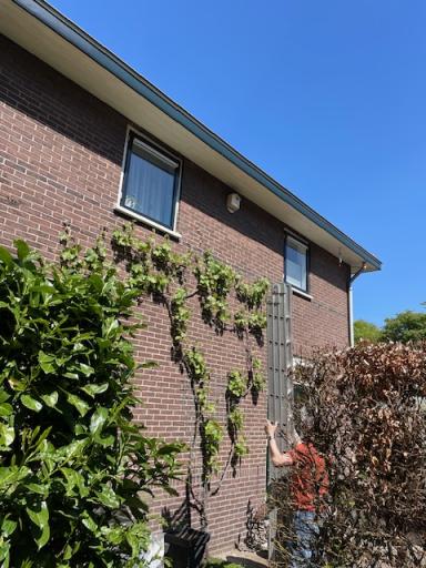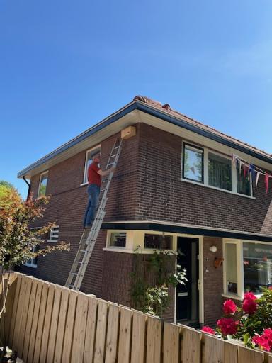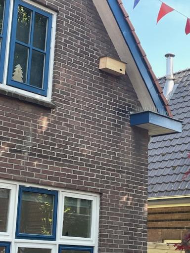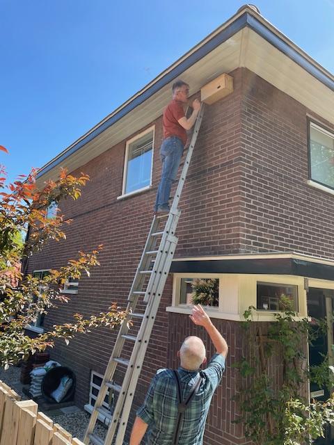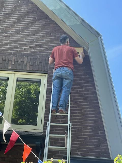 Twee sterke mannen (zonder hoogtevrees) uit de straat hebben geholpen met ophangen en wel net op tijd: gisteren opgehangen en vanmorgen 29 april de eerste twee gierzwaluwen gezien boven onze tuin, super, laat ze maar komen!