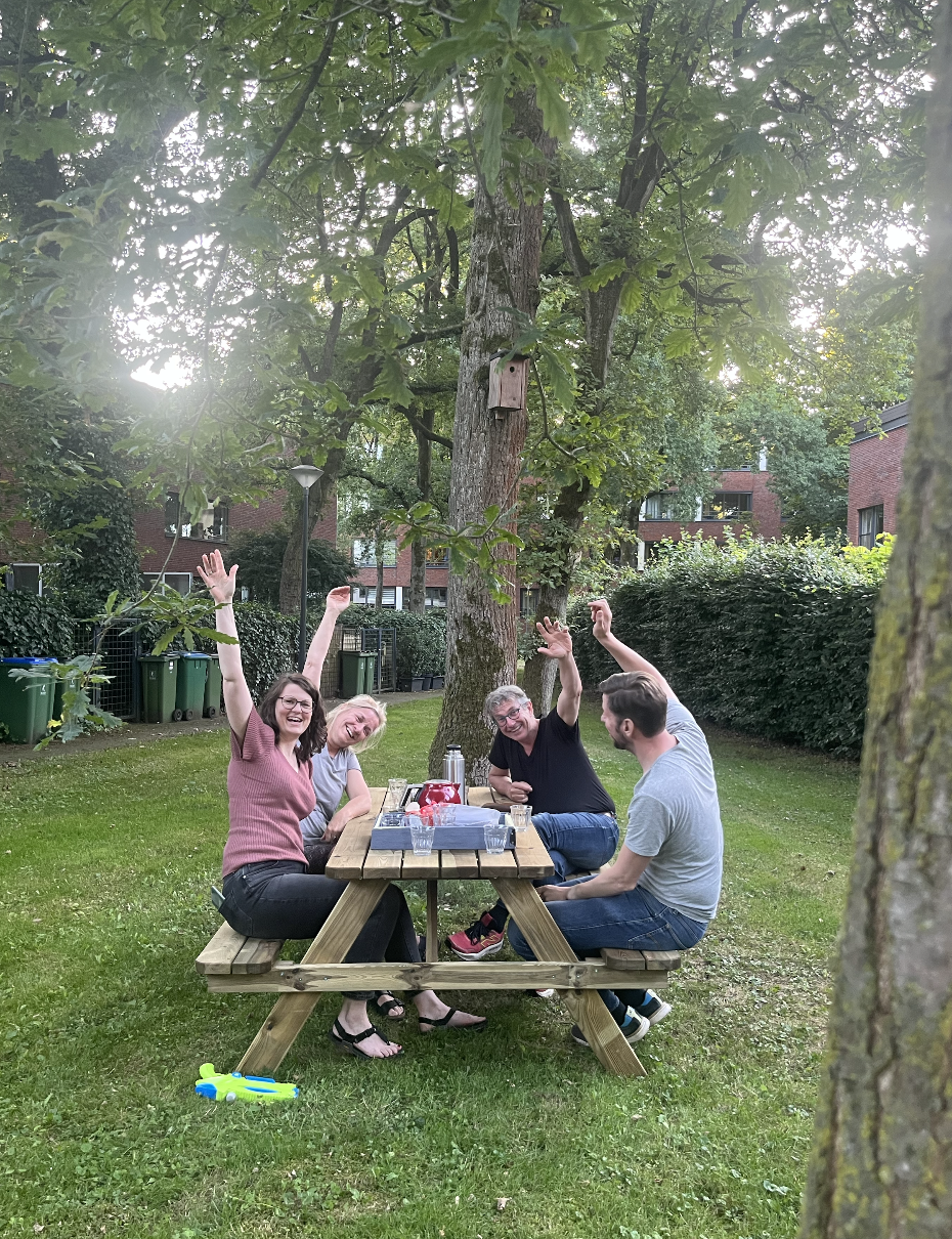 Samen sjouwen, samen bouwen! We hebben onze tafel vanavond in elkaar gezet. En, zo zie je maar weer, een project brengt mensen samen. De ene na de andere buurtbewoner kwam even polshoogte nemen, et voila, eind van de avond zaten we met z'n 9enen aan de tafel, met thee van Sandra, de boormachine van Teus en koekjes van Femke.