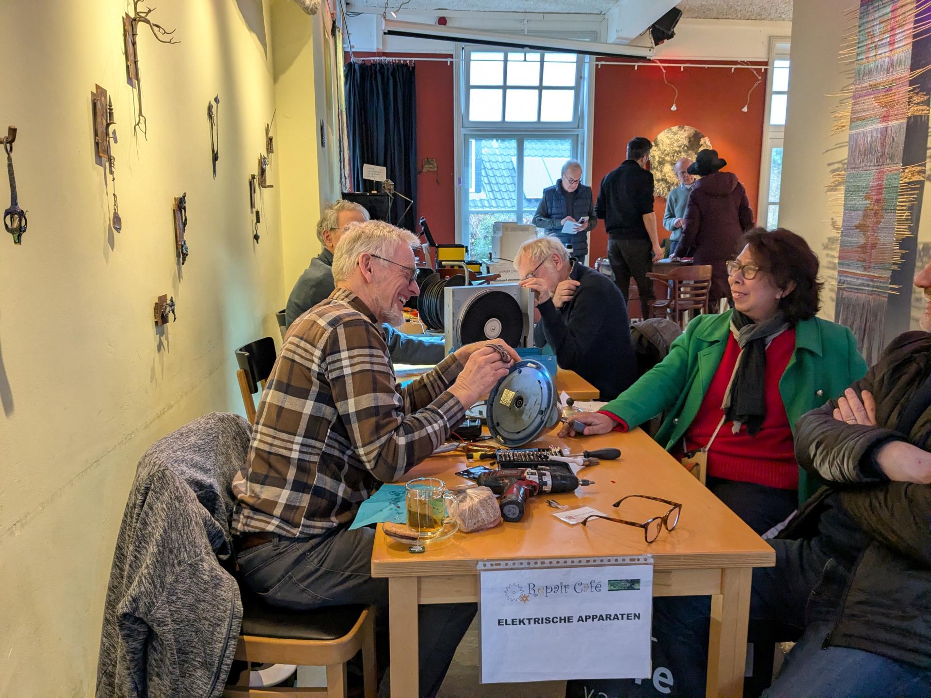 Sinds maart 2025 zijn er weer 12 Repaircafés georganiseerd in Oosterbeek, op verschillende locaties. Eénmaal maakten we (op verzoek) een uitstapje naar Het Schild in Wolfheze. Het eerste Repaircafé in Oosterbeek, en daarmee in de gemeente Renkum, was in 2013. Repaircafés zijn bijeenkomsten in openbare gelegenheden waar vrijwilligers je helpen met allerhande reparaties en ook bijvoorbeeld klein verstelwerk aan je kleding. Het is leuk om te zien hoe de handige reparateurs elkaar dan met raad en daad bijstaan en samen soms heel ingewikkelde electronica weer aan de praat krijgen. Ons Repaircafé wordt in de lucht gehouden door vrijwillige bijdragen van de bezoekers. Naast het betalen van de onze materialen (en soms huur van de ruimte) kunnen we daarvan ook één- of tweemaal per jaar gezellig samen eten. Met de bijdrage van Renkum Verbindt kochten we een paar spulletjes die we ons tot nu toe niet konden veroorloven maar die wel belangrijk zijn, zoals beschermateriaal voor de tafels en een mooie beachflag.